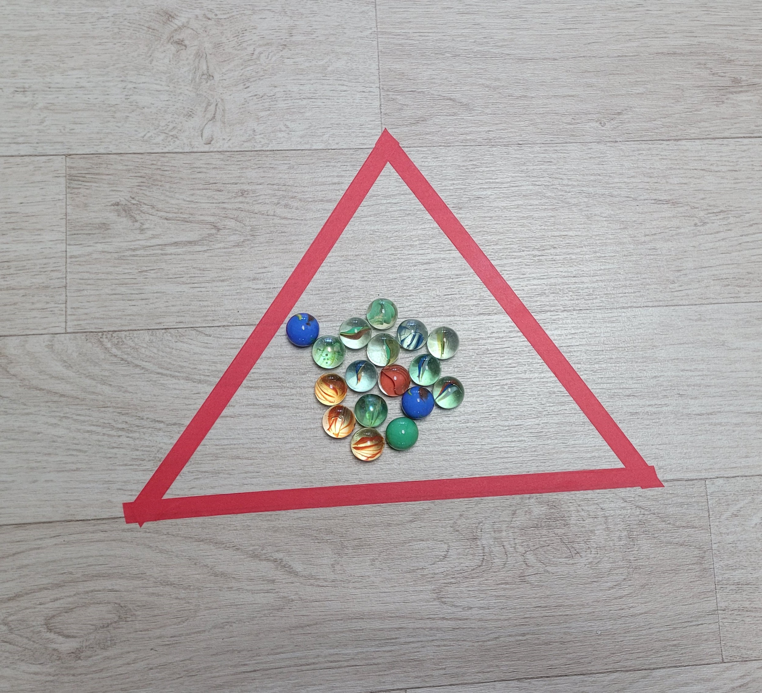 구슬치기 게임규칙은 엄청 다양하겠지만, 첫번째로 아이들과 함께 했던 것은 각자 똑같은 갯수로 구슬을 나누어 갖고, 5개씩 빨간색 삼각형 안에 넣었습니다.