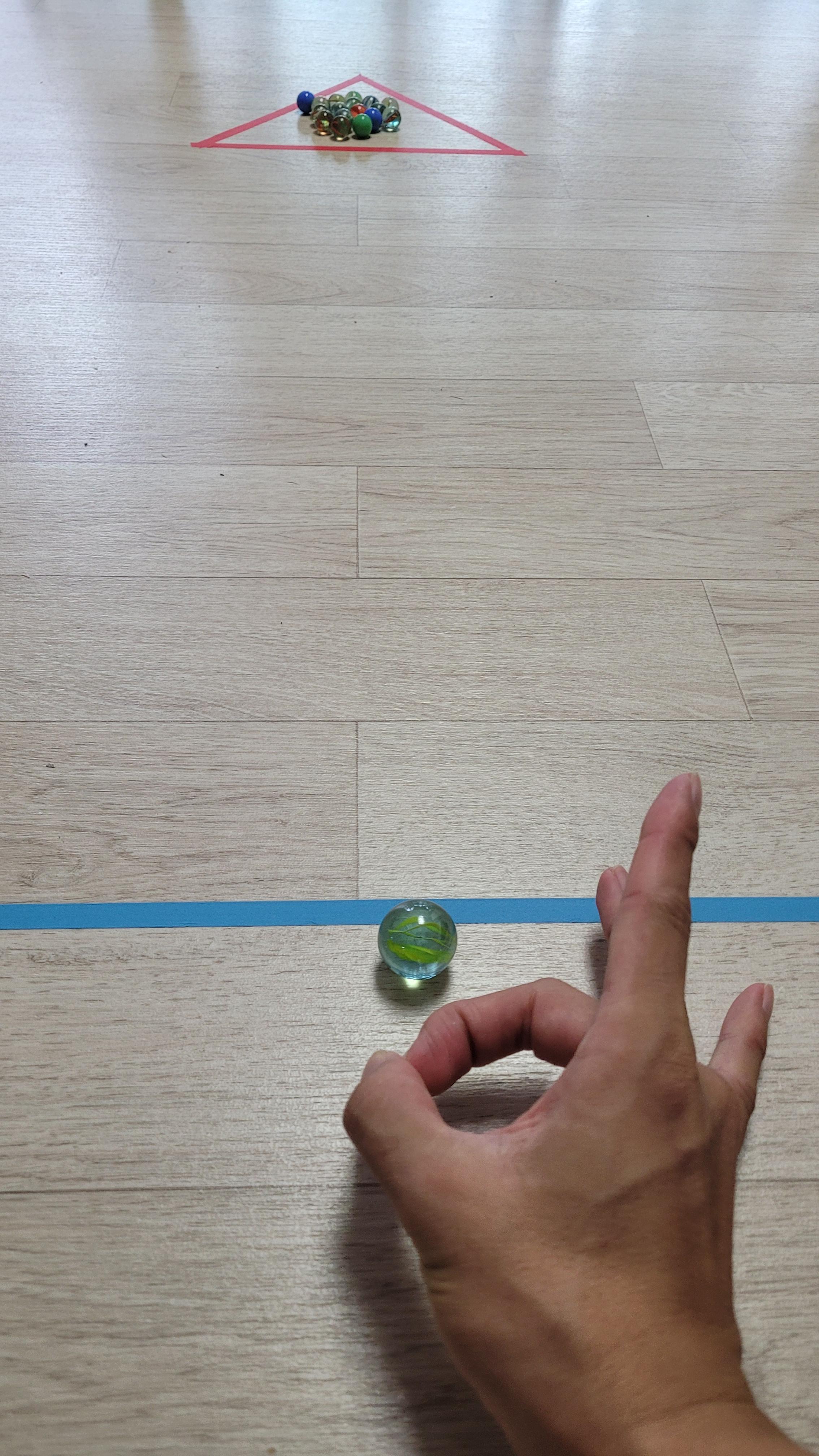 그리고나서 파란색 선에서 구슬을 튕기거나 던져서 삼각형 안에 있는 구슬을 쳐내면 따는 방법으로 진행했습니다.