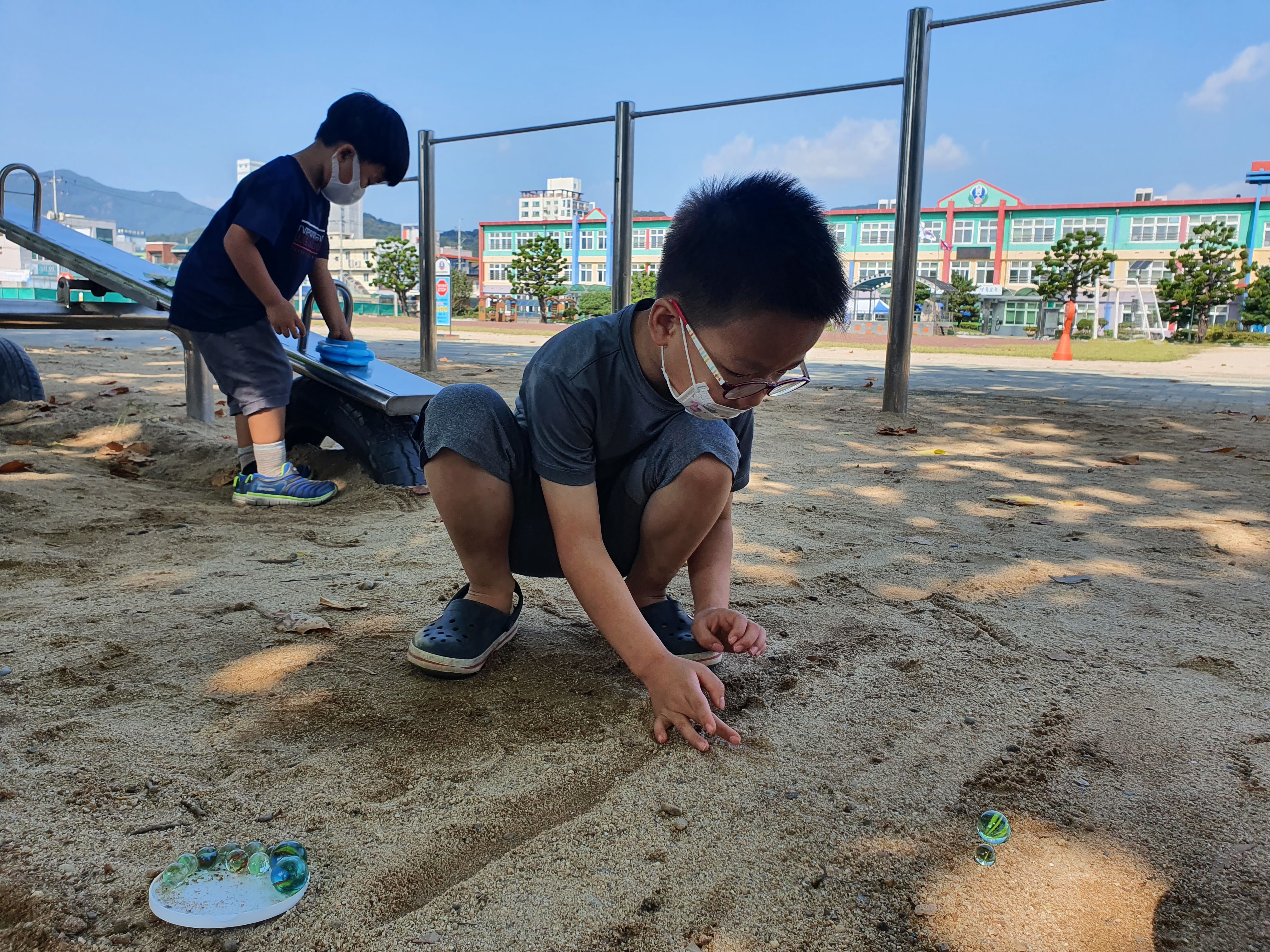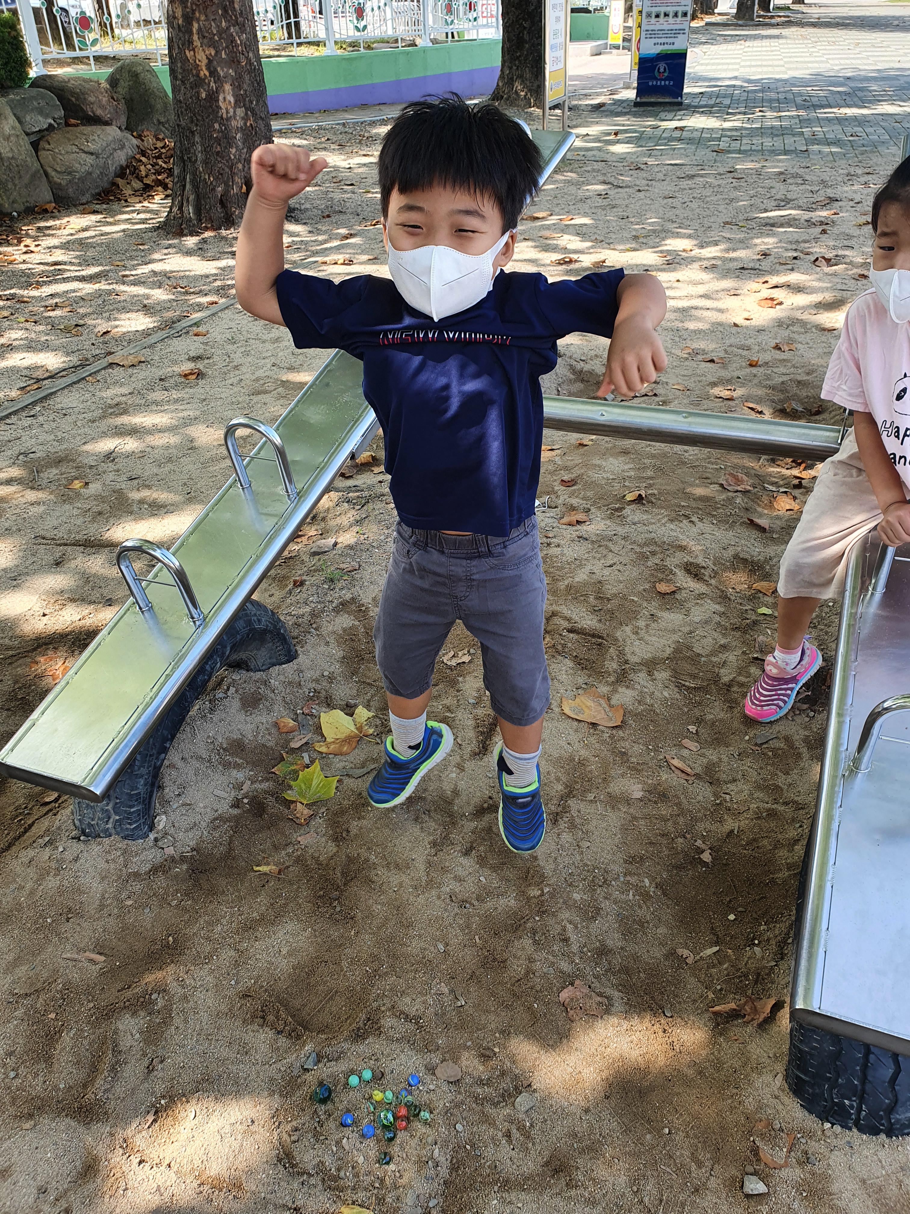 게임을 하다보면 다 잃은 사람이 생기고, 그러면 가장 많은 아이가 다 잃은 아이에게 자신의 구슬을 나누어줍니다. 그리고 그 구슬을 받은 아이가 나중에 구슬을 많이 따게 되니 구슬을 주었던 아이에게 왕구슬로 갚아줍니다. 서로 깐부가 되었네요~ 구슬 하나로 두시간이 넘게 신나게 놀았습니다. 가까운 다이소에서 구슬을 구입해서 아이들과 함께 한번 놀아보세요~^^