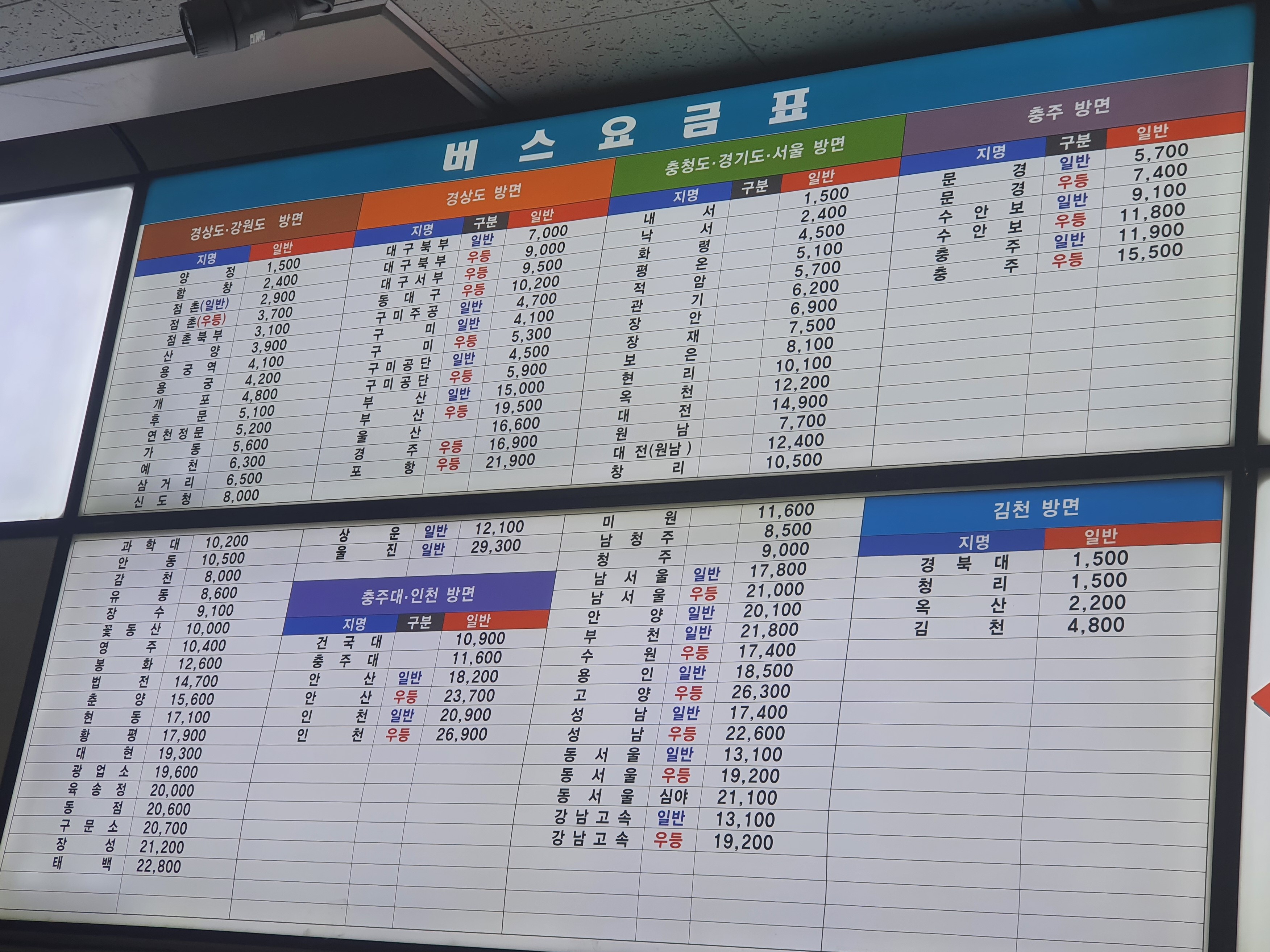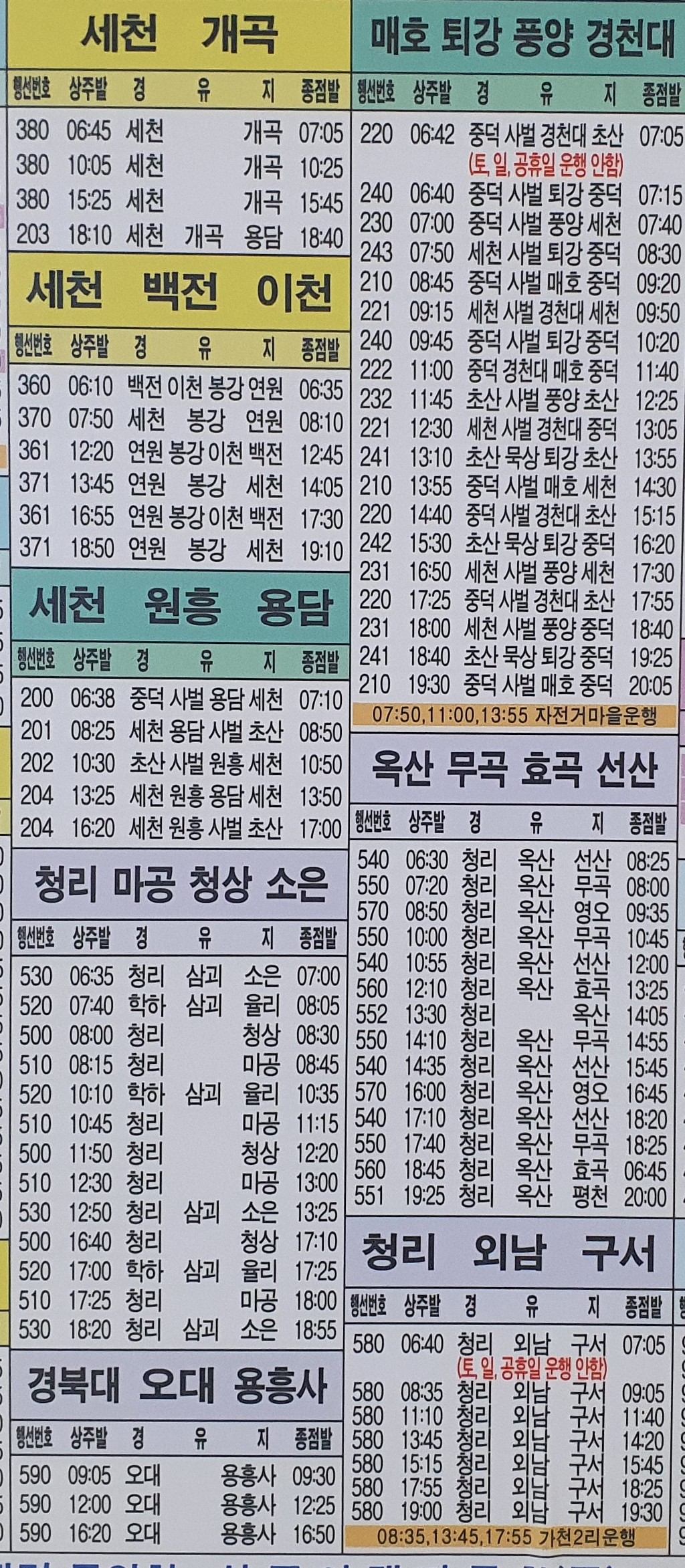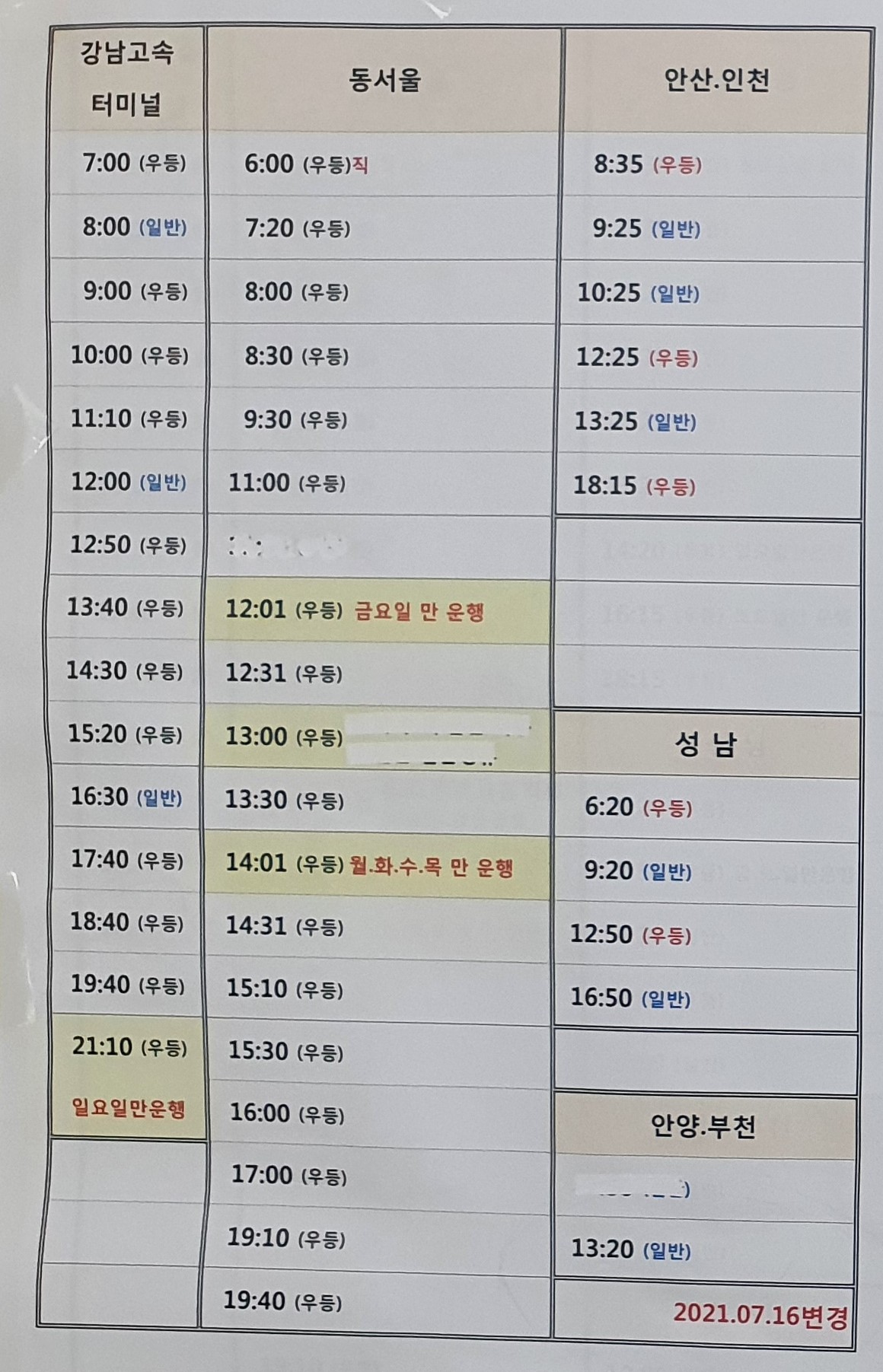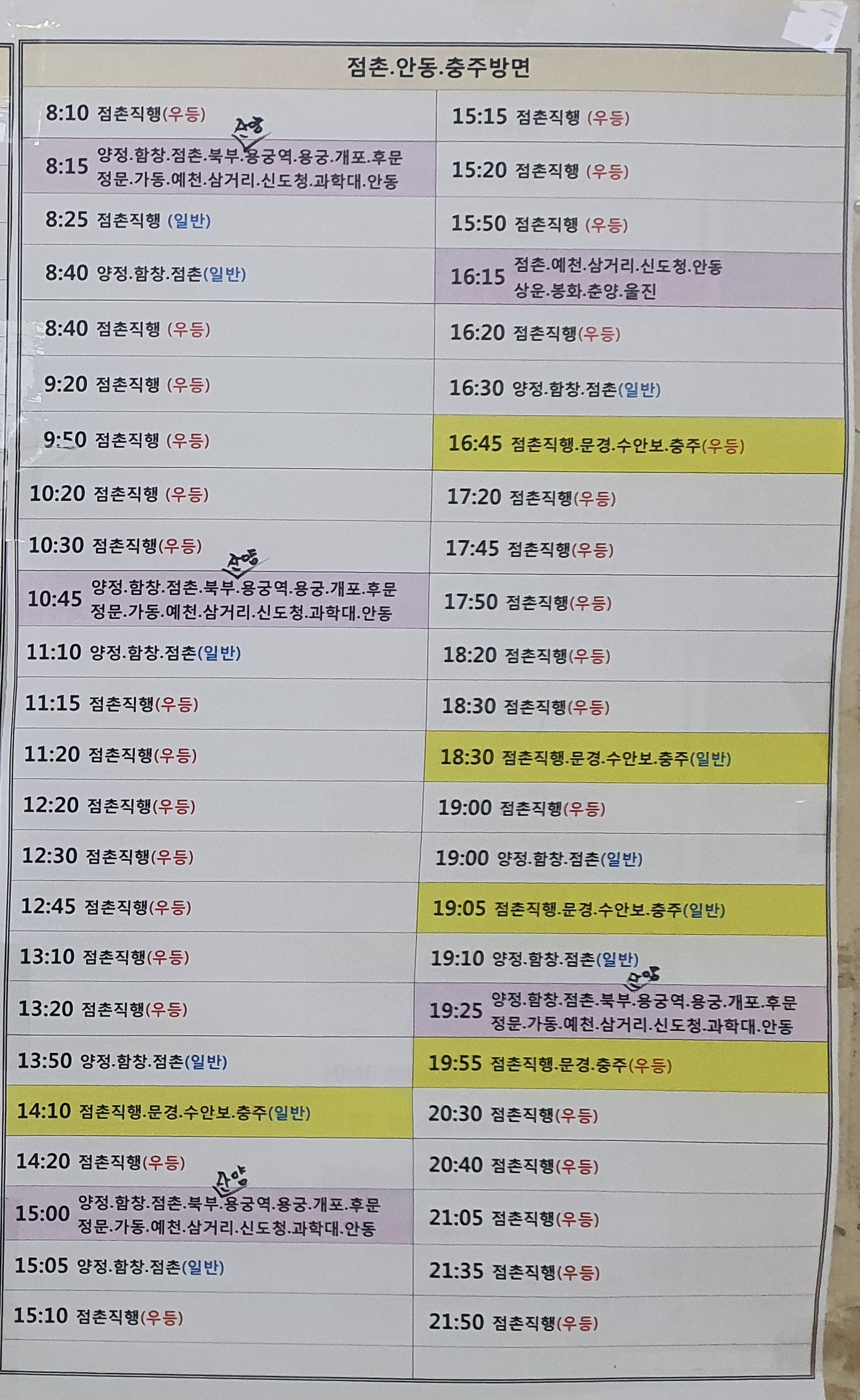 커피가 나오는 동안 터미널 안에 들어가보았는데, 코로나로 인해 버스 시간표가 자주 바뀌는지, 종이로 프린트되어 있어서 한번 시간표를 찍어보았습니다.